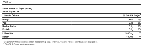 L-Karnitine Thermo her servis 2000 mg l-karnitin ve 100 mg Kafein içerir. Sıvı formda üretilmiş olup kullanım kolaylığı sağlamaktadır. Sıvı L-karnitin Thermo karpuz, şeftali ve yeşil elma aroma seçenekleri bulunmaktadır.